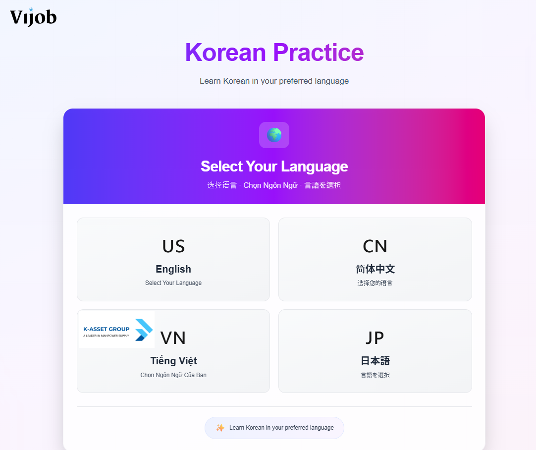 이번에 공개된 ‘Vijob Korean Practice’(korean.vijob.net)'은 해외 각국의 송출 파트너를 통해 선발된 근로자들이 출국 전부터 온라인으로 한국어를 쉽고 체계적으로 학습할 수 있도록 지원하는 교육 플랫폼입니다.이 서비스는 영어, 베트남어, 일본어, 중국어 등 다국어 기반 학습 시스템으로 구성되어 있으며,기초 회화부터 실생활 표현, 직장 내 기본 의사소통까지 실제 근로 환경 중심의 한국어 교육 콘텐츠를 제공합니다.