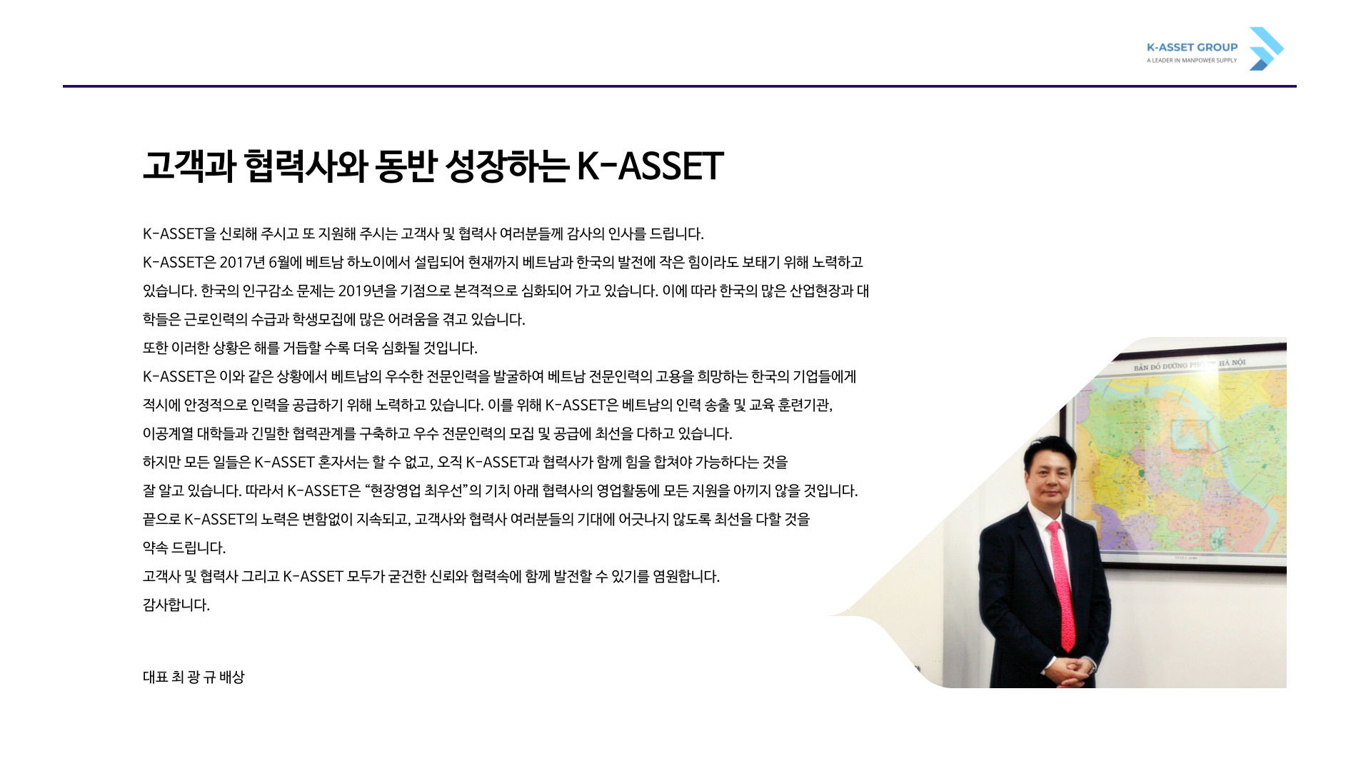 K-ASSET은 이번 협력을 계기로 베트남 인재 발굴 → 사전교육(Pre-departure Training) → 비자행정 → 출국 후 관리까지 모든 과정을 직접 관리하며, 한국 기업들이 신뢰할 수 있는 해외 인재를 빠르고 안정적으로 채용할 수 있는 구조를 구축합니다.